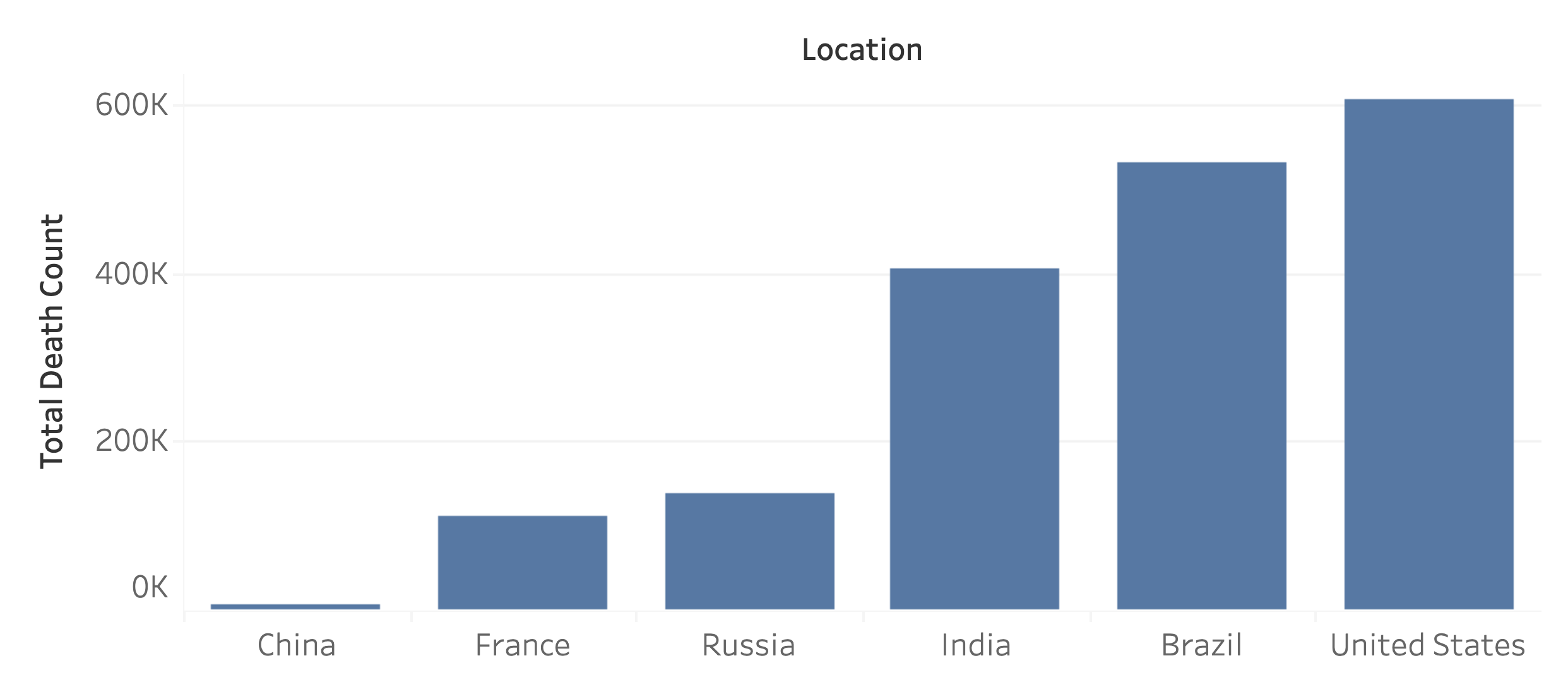 Next, I began querying data to formulate the death count of six countries: the United States, Brazil, India, Russia, France, and China. I chose the first five countries where the death toll was most significant when I initiated this project. I also chose China due to COVID-19 allegedly originating there. Once I decided which countries to include in my query, I only needed to add the new_deaths.